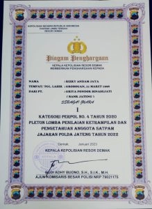 Rizky Adam Jaya tenaga outsourcing PT Grinatha yang bertugas di Bank Jateng Kantor Cabang Demak, menerima penghargaan dari Kapolres Demak atas prestasinya sebagai juara 1 Lomba Penilaian Keterampilan dan Pengetahuan Anggota Satpam Jajaran Polda Jateng Tahun 2022 dalam rangka HUT Satpam ke 42.
